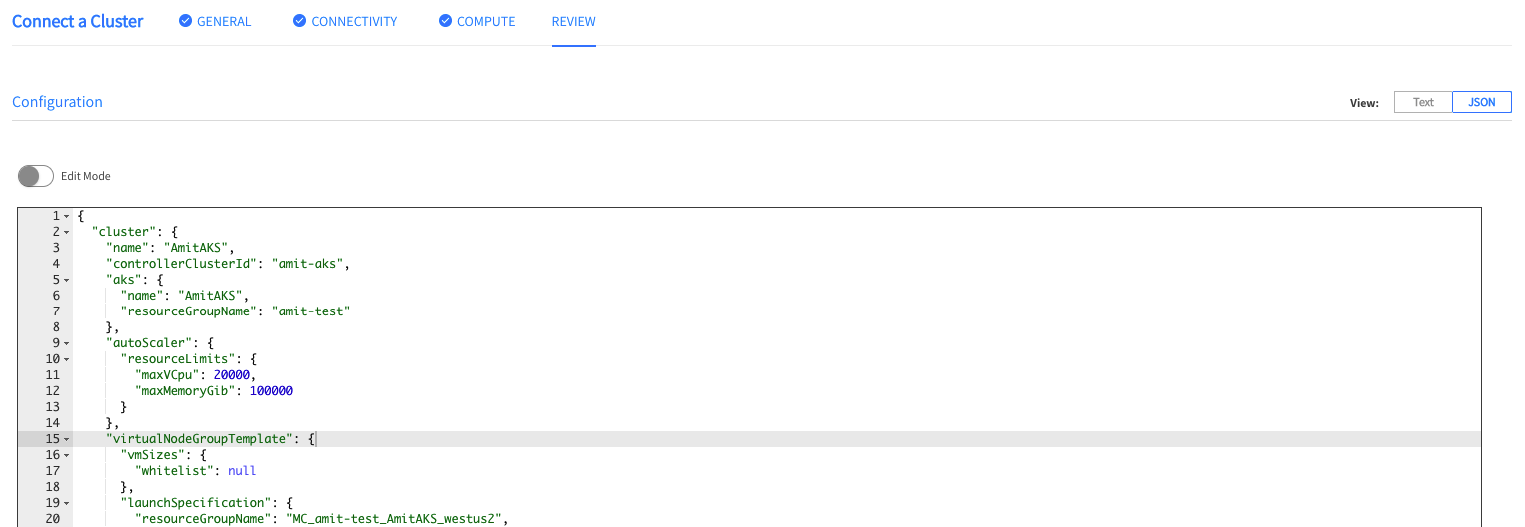 In the Review page, you can see a summary of the entire configuration. You also have the option to view the configuration in JSON format.